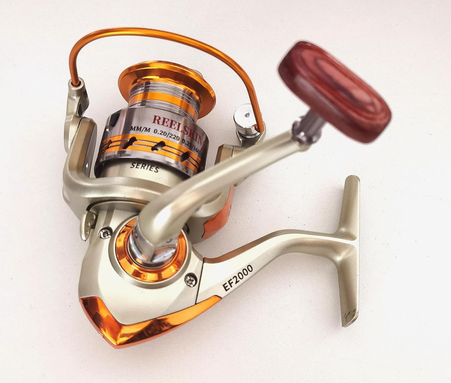 Professional engineering plastic body, Metal line cup, Wooden Knob Metal folding rocker arm,Right & Left handed interchangable Ultra Smooth, Lightweight Spinning Reel, Copper toothed rod drive, zinc alloy high hardness toothed disc Champagne color, exquisitely crafted, high-end and atmospheric, with metal sound pads and coarse polishing line configuration. Can be used in Saltwater Fishing, Freshwater Fishing, Boat Fishing, Rock Fishing, Carp Fishing, Bass Fishing, Surf Fishing, Lake Fishing, River Fishing